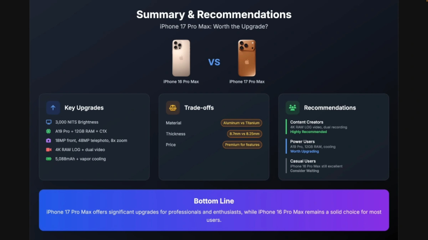 कुल मिलाकर, iPhone 17 Pro Max कई महत्वपूर्ण अपग्रेड्स प्रदान करता है, जिनमें 3,000 निट्स का नया डिस्प्ले, A19 प्रो चिप, 12 GB रैम, C1X चिप, 18 मेगापिक्सल का फ्रंट-फेसिंग कैमरा, 8x ऑप्टिकल जूम के साथ 48 मेगापिक्सल का टेलीफोटो लेंस, 40x डिजिटल जूम, 4K रॉ लॉग वीडियो रिकॉर्डिंग, डुअल वीडियो रिकॉर्डिंग, बड़ी 5,088 mAh बैटरी और वेपर कूलिंग सिस्टम शामिल हैं। Apple का कहना है कि इस बार फोन को "जमीन से ऊपर" फिर से बनाया गया है, न कि केवल चिप्स या कैमरों को बदला गया है। हालांकि, एक ट्रेड-ऑफ यह है कि टाइटेनियम के बजाय एल्यूमीनियम का उपयोग किया गया है। यह थोड़ा मोटा भी है, लेकिन इसकी कीमत पिछले मॉडल के समान रखी गई है, जो एक अच्छी खबर है। यदि आप एक पेशेवर उपयोगकर्ता या उत्साही हैं जो नवीनतम तकनीक, बेहतर कैमरा क्षमताओं और विस्तारित बैटरी जीवन का अधिकतम लाभ उठाना चाहते हैं, तो iPhone 17 Pro Max निश्चित रूप से अपग्रेड करने लायक है। खासकर कंटेंट क्रिएटर्स और पावर यूजर्स के लिए, 4K लॉग वीडियो और A19 प्रो चिप के साथ 12 GB रैम जैसे फीचर्स बेहद फायदेमंद होंगे। हालांकि, यदि आप अभी भी एक iPhone 16 Pro Max के मालिक हैं और यह आपको एक अच्छे सौदे पर मिल सकता है, या यदि आपको इसका टाइटेनियम डिज़ाइन पसंद है, तो यह अभी भी अधिकांश उपयोगकर्ताओं के लिए एक ठोस विकल्प बना हुआ है। iPhone 16 Pro Max भी पिछले साल एक बेहतरीन फोन था, लेकिन iPhone 17 Pro Max ने इसे काफी हद तक आगे बढ़ा दिया है।
