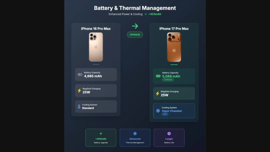 बैटरी जीवन में iPhone 17 Pro Max एक और बड़ा सुधार लेकर आया है। iPhone 16 Pro Max में 4,685 मिलीएम्पियर घंटे (mAh) की बैटरी थी, जबकि iPhone 17 Pro Max में अब 5,088 mAh की बैटरी है। यह लगभग 403 mAh का अपग्रेड है, जो फोन के उपयोग की अवधि में उल्लेखनीय वृद्धि करेगा। यह 5,000 mAh से अधिक की बैटरी क्षमता सैमसंग गैलेक्सी S25 अल्ट्रा प्लस जैसे प्रतिद्वंद्वी फोन से भी अधिक है, और A19 प्रो चिप की बेहतर दक्षता के साथ, यह और भी लंबे समय तक चलेगी। चार्जिंग के संबंध में, iPhone 17 Pro Max अब MagSafe G2.2 के साथ संगत है, जिसका अर्थ है कि आप 25 वाट तक की चार्जिंग के लिए तीसरे पक्ष के पावर बैंक और अन्य सहायक उपकरण का उपयोग कर सकते हैं। पहले, 25 वाट चार्जिंग के लिए Apple के आधिकारिक MagSafe का उपयोग करना पड़ता था। इसके अतिरिक्त, iPhone 17 Pro Max में एक नया कूलिंग वेपर सिस्टम शामिल है, जो फोन को चार्ज करते समय या भारी उपयोग के दौरान ठंडा रखने में मदद करेगा। ये सभी सुधार एक साथ मिलकर उन्नत थर्मल प्रबंधन और लंबी, बेहतर बैटरी लाइफ सुनिश्चित करते हैं, जिससे उपयोगकर्ताओं को अधिक सुविधा मिलती है।