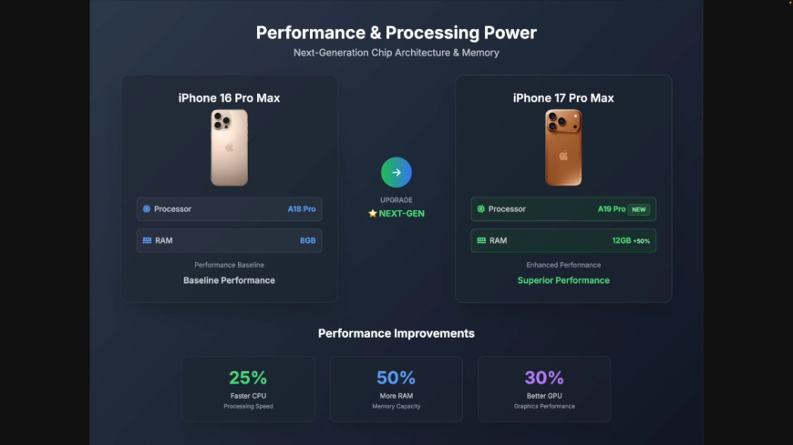 iPhone 17 Pro Max के अंदरूनी हिस्से में सबसे बड़ा अपग्रेड इसका चिपसेट है। पिछले iPhone 16 Pro Max में शक्तिशाली A18 प्रो चिप थी, जो एक छह-कोर सीपीयू के साथ शानदार प्रदर्शन प्रदान करती थी। अब, iPhone 17 Pro Max में बिल्कुल नई A19 प्रो चिप और एक अतिरिक्त C1X चिप लगाई गई है। A19 प्रो भी एक छह-कोर सीपीयू है, लेकिन यह अधिक कुशल होने का वादा करती है, जिससे बेहतर प्रदर्शन और बैटरी जीवन मिलेगा। इसके साथ ही, रैम में भी 50% की वृद्धि की गई है। जहाँ iPhone 16 Pro Max में 8 GB रैम थी, वहीं iPhone 17 Pro Max अब 12 GB रैम के साथ आता है। यह वृद्धि एक साथ कई ऐप चलाने, मल्टीटास्किंग करने और भविष्य के सॉफ्टवेयर अपडेट को बेहतर ढंग से संभालने में महत्वपूर्ण रूप से मदद करेगी। यह उन उपयोगकर्ताओं के लिए विशेष रूप से फायदेमंद होगा जो अपने फोन का उपयोग गहन कार्यों, जैसे वीडियो संपादन या उच्च-ग्राफिक्स गेमिंग के लिए करते हैं। यह परफॉर्मेंस अपग्रेड फोन के समग्र अनुभव को बेहतर बनाता है और इसे भविष्य के लिए तैयार करता है।