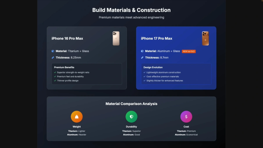 नए iPhone 17 Pro Max और iPhone 16 Pro Max दोनों में 6.9 इंच का डिस्प्ले है, लेकिन iPhone 17 Pro Max की चमक में महत्वपूर्ण सुधार किया गया है। जहाँ iPhone 16 Pro Max में 2,000 निट्स की अधिकतम चमक थी, वहीं नए iPhone 17 Pro Max में यह बढ़कर 3,000 निट्स हो गई है, जो सीधे धूप में या उज्ज्वल वातावरण में दृश्यता को काफी बेहतर बनाएगी। हालांकि, दोनों मॉडलों में 120 Hz प्रोमोशन डिस्प्ले तकनीक बरकरार रखी गई है, जो स्मूथ स्क्रॉलिंग और प्रतिक्रियाशील अनुभव प्रदान करती है। डिज़ाइन के मामले में, Apple ने एक दिलचस्प बदलाव किया है। iPhone 16 Pro Max में टाइटेनियम और ग्लास का उपयोग किया गया था, जो अपनी बेहतर ताकत-से-वजन अनुपात, प्रीमियम अनुभव और स्थायित्व के लिए जाना जाता था। इसके विपरीत, iPhone 17 Pro Max अब एल्यूमीनियम और ग्लास से बना है। इसे कुछ लोग एक कदम पीछे मान सकते हैं, क्योंकि टाइटेनियम एक अधिक प्रीमियम सामग्री थी, लेकिन Apple ने इसे लागत प्रभावी बनाने और संभवतः अन्य उन्नत सुविधाओं के लिए जगह बनाने के लिए बदला है। नया मॉडल थोड़ा मोटा भी है, iPhone 16 Pro Max की 8.25 मिमी की मोटाई की तुलना में iPhone 17 Pro Max 8.7 मिमी मोटा है, हालांकि यह अंतर बहुत मामूली है। यह बदलाव, हालांकि थोड़ा पीछे की ओर लगता है, फोन को हल्का रखने में मदद करता है और Apple को कुछ खर्चों में कटौती करने की अनुमति देता है। यह ध्यान रखना महत्वपूर्ण है कि iPhone 17 Pro Max में एल्यूमीनियम का उपयोग अभी भी एक प्रीमियम सामग्री के रूप में किया जाता है।