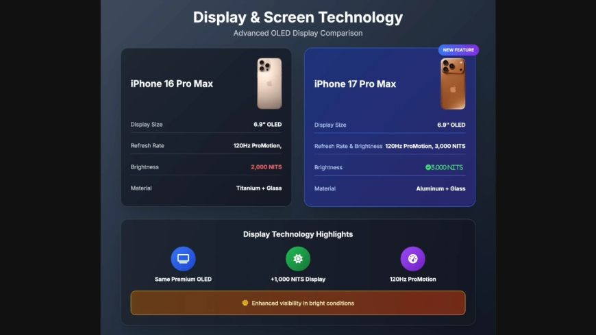 iPhone 17 Pro Max के नवीनतम अपग्रेड्स जानें! डिस्प्ले, कैमरा, परफॉर्मेंस और बैटरी में हुए बड़े बदलावों की तुलना iPhone 16 Pro Max से करें।